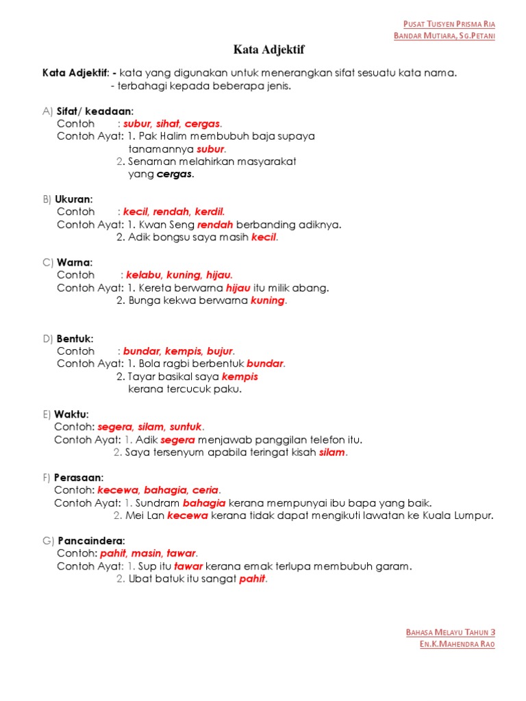 Contoh Ayat Kata Adjektif Materi Pelajaran 1