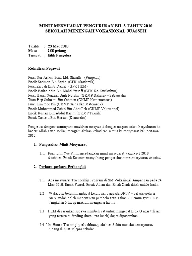 Contoh Minit Mesyuarat Mudah Dan Lengkap Jawatan Kosong