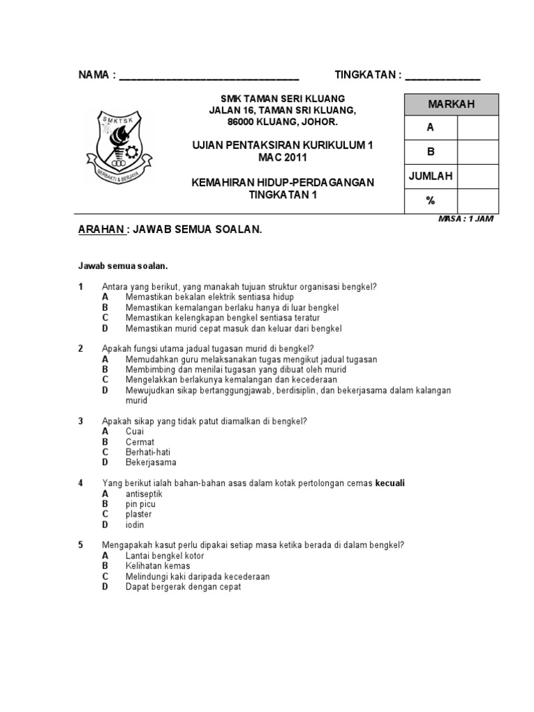 Soalan Kemahiran Hidup Tingkatan 1 Teras