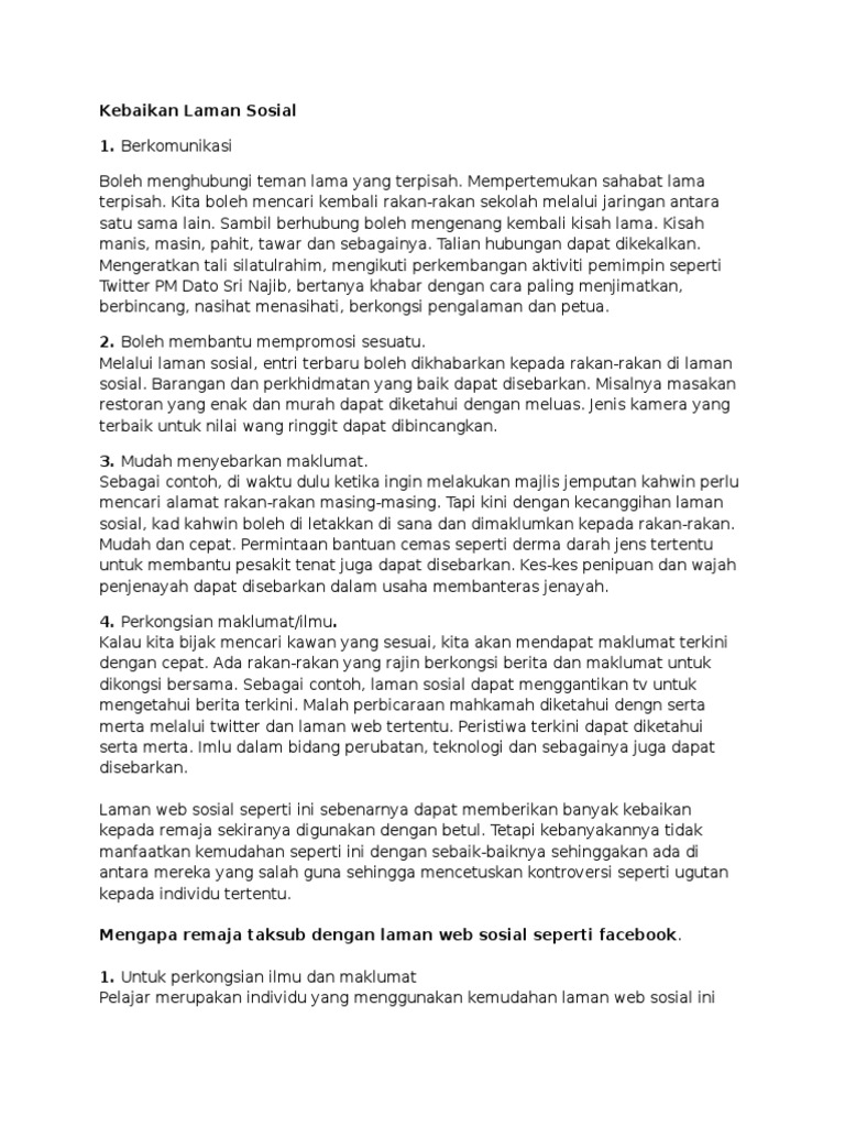 Pelbagai teknologi komunikasi termasuk media. Sebagai rujukan kepada pelajar dibawah dikongsikan contoh karangan punca ketagihan media sosial dalam kalangan remaja. Kementerian pembangunan wanita keluarga dan masyarakat akan melaksanakan program sekata. Komunikasi merentas sempadan kerja melalui teknologi dan media sosial.