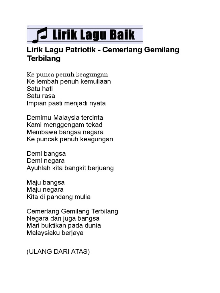 Tuliskan Lirik Lagu Cemerlang Gemilang Terbilang Yang Telah Anda Pelajari Dengan Jelas Dan Lengkap
