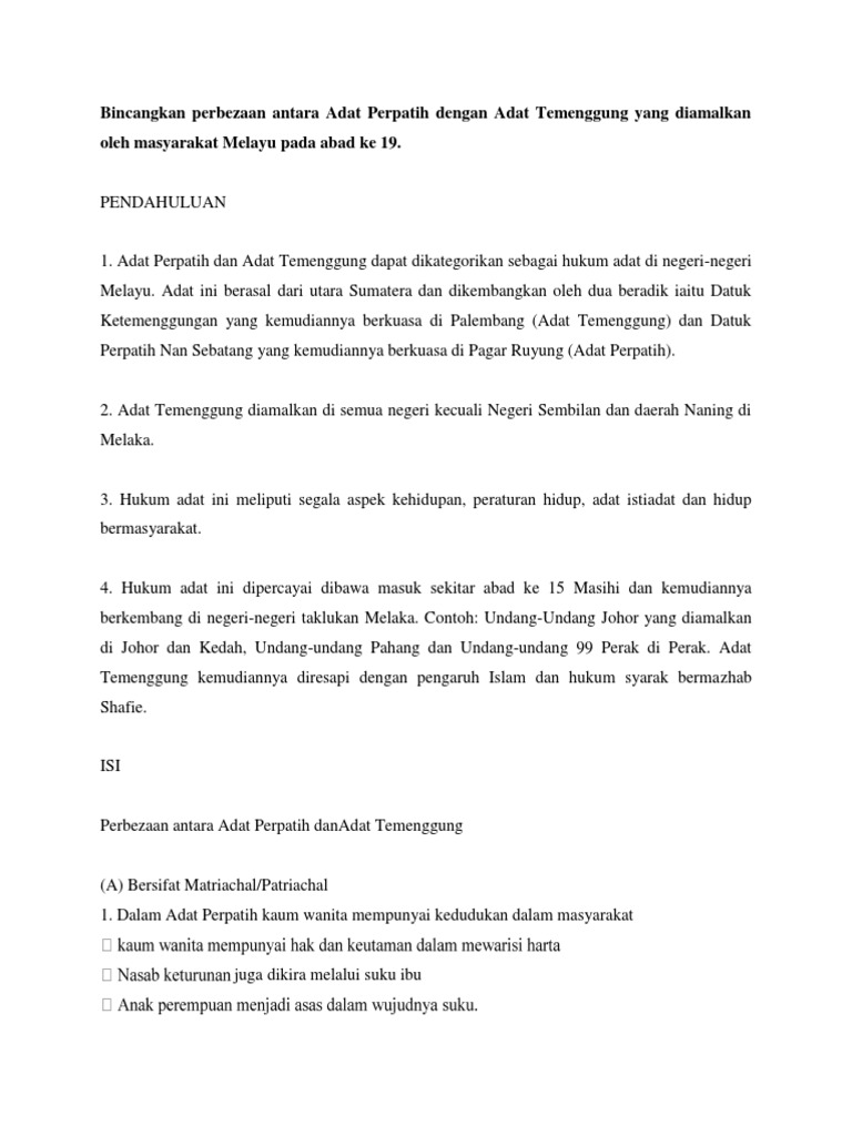 Perbezaan Adat Perpatih Dgn Adat Temengguung Sejarah Stpm Penggal 3 Docx Document