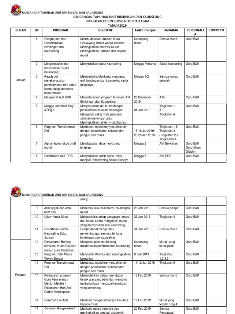 Rancangan Tahunan Unit Bimbingan Dan Kaunseling 2019 Terkini 3 Docx
